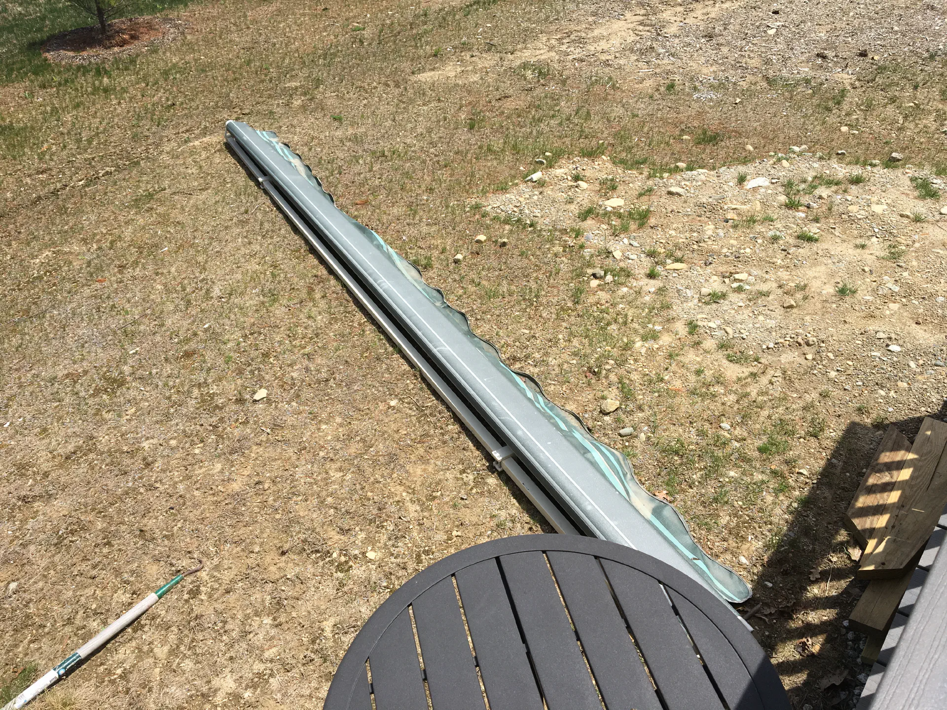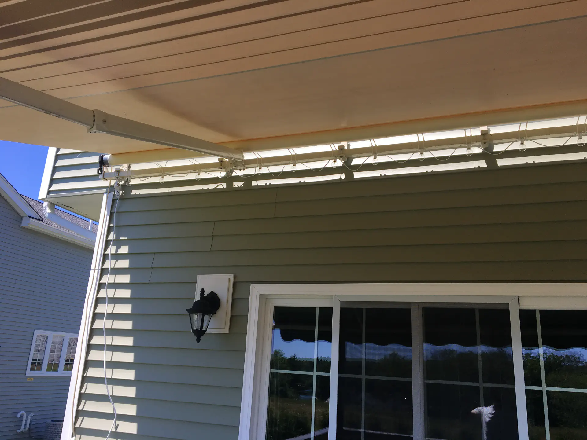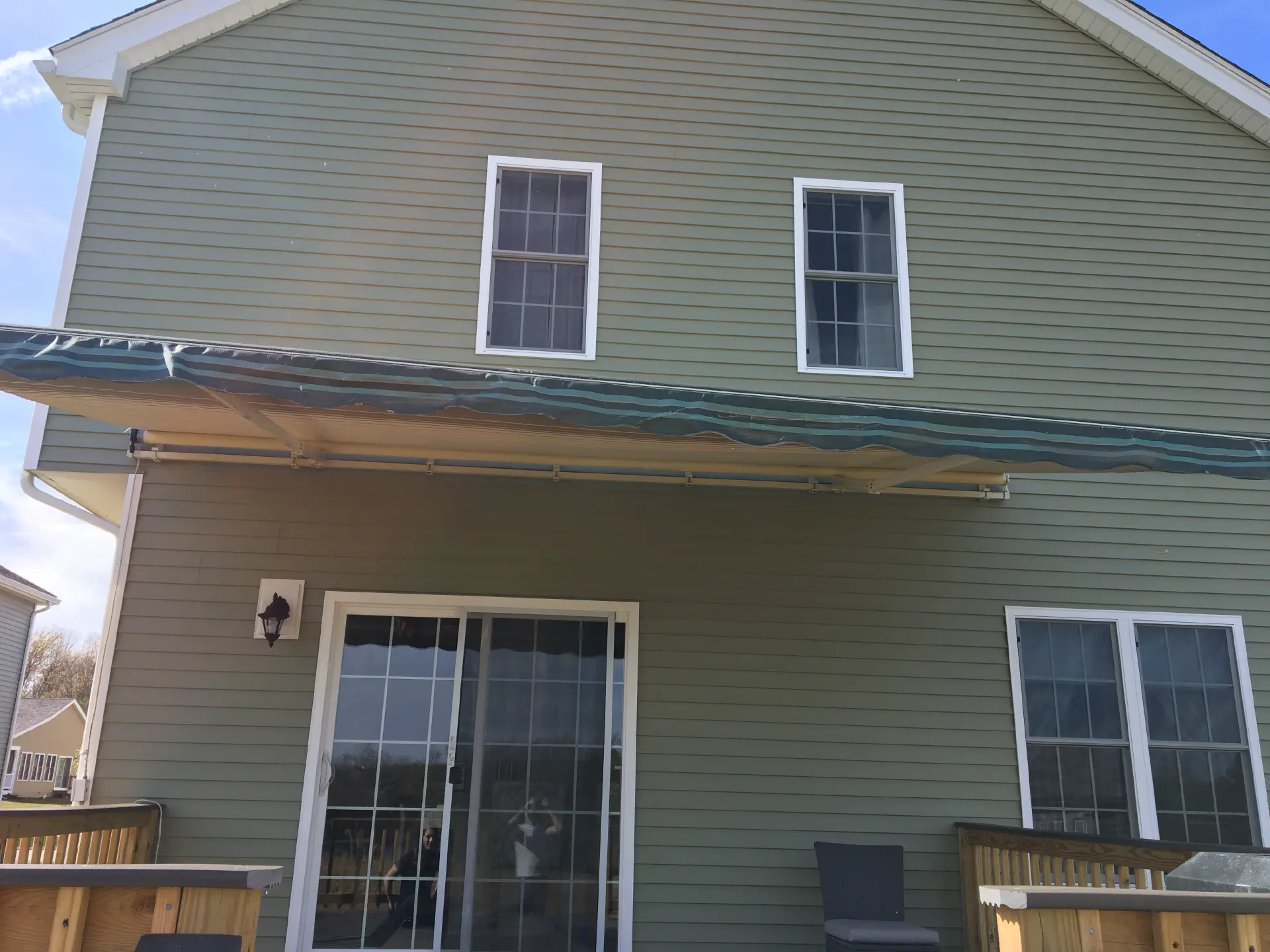 To shade ourselves during the summer heat, we added an awning overhead. Luckily, our family had just pulled one off of their house, so we could recycle it on to our own, and it roughly matched. To mount the brackets, we needed to get some nylon spacers so we didn't need to remove the vinyl siding. We found a thickness that was slightly larger than the depth of our vinyl siding and mounting it towards the top of each piece so it wouldn't squeeze the siding. After mounting the awning, it took a bit to actually get the awning balanced. Some set screws in the arms of the awning move each side up and down separately.