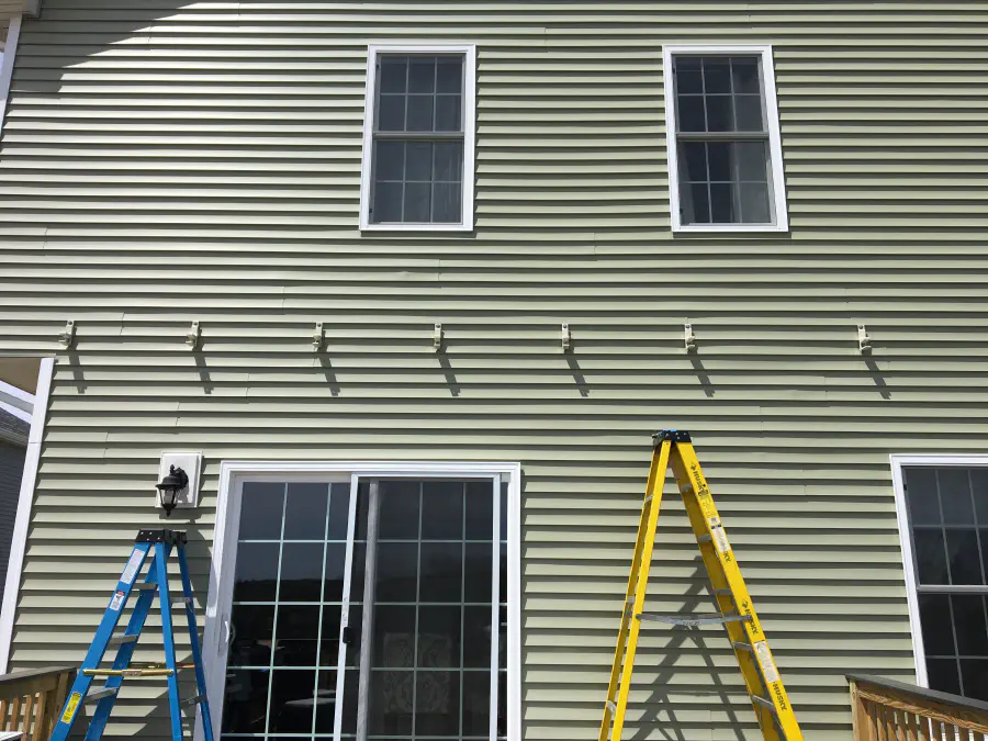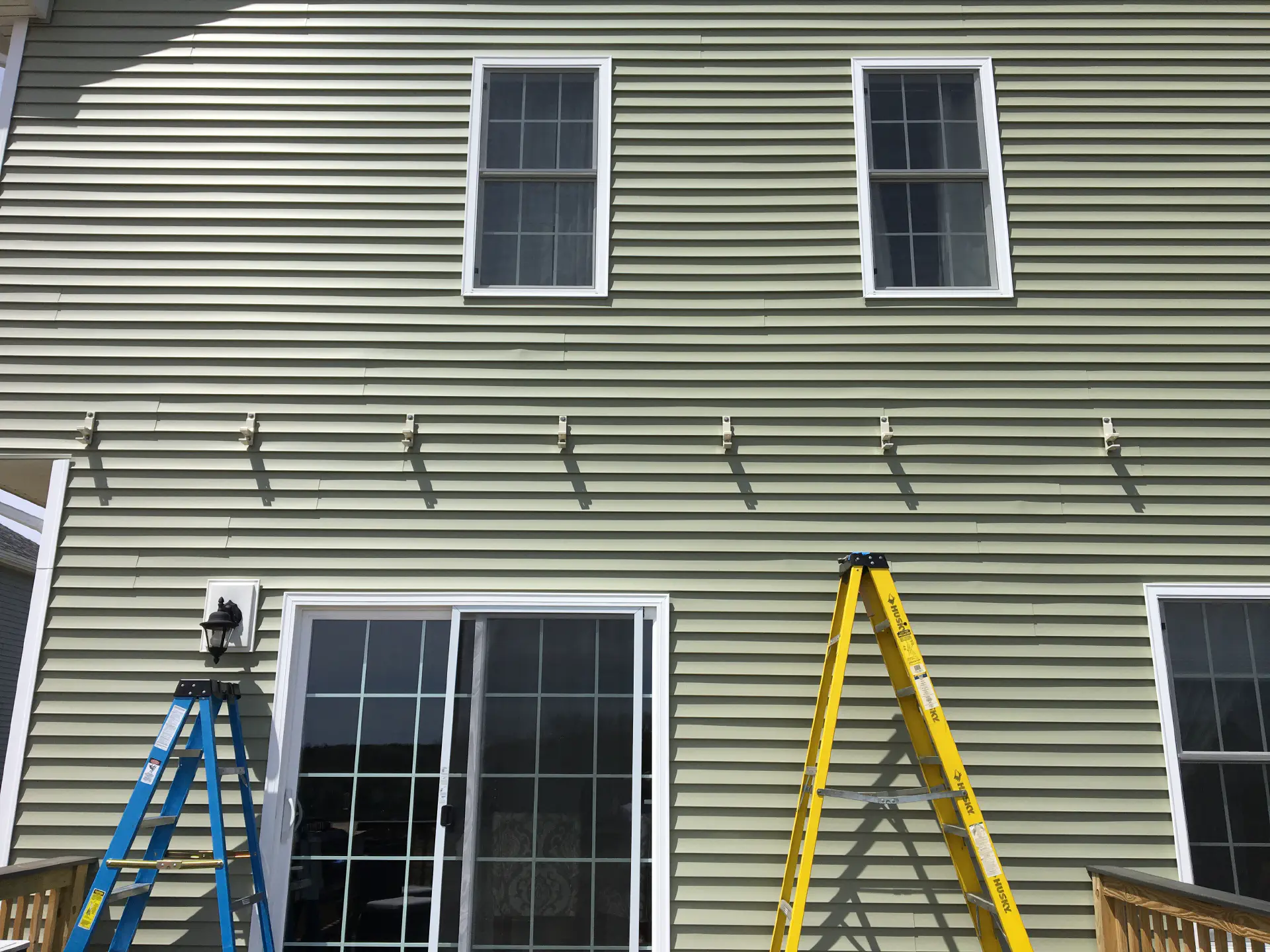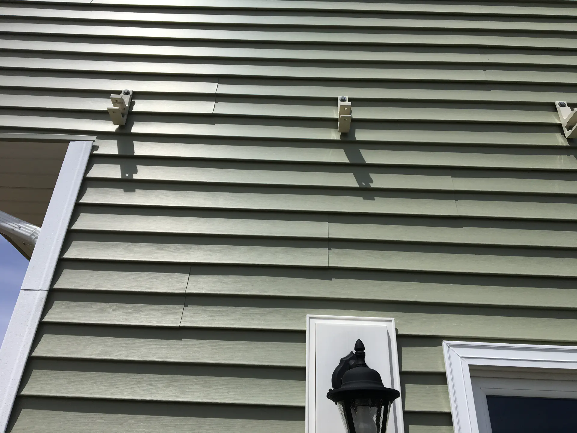 To shade ourselves during the summer heat, we added an awning overhead. Luckily, our family had just pulled one off of their house, so we could recycle it on to our own, and it roughly matched. To mount the brackets, we needed to get some nylon spacers so we didn't need to remove the vinyl siding. We found a thickness that was slightly larger than the depth of our vinyl siding and mounting it towards the top of each piece so it wouldn't squeeze the siding. After mounting the awning, it took a bit to actually get the awning balanced. Some set screws in the arms of the awning move each side up and down separately.