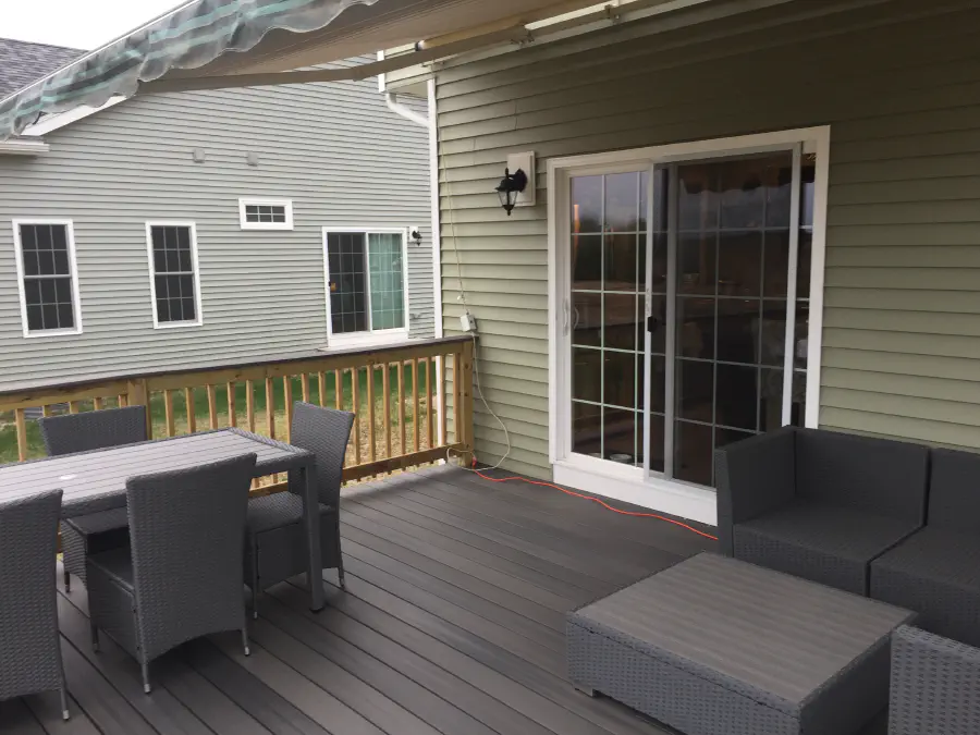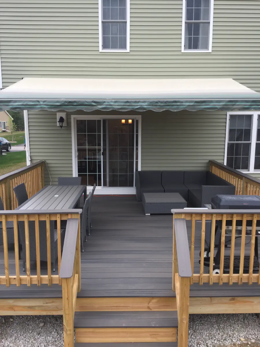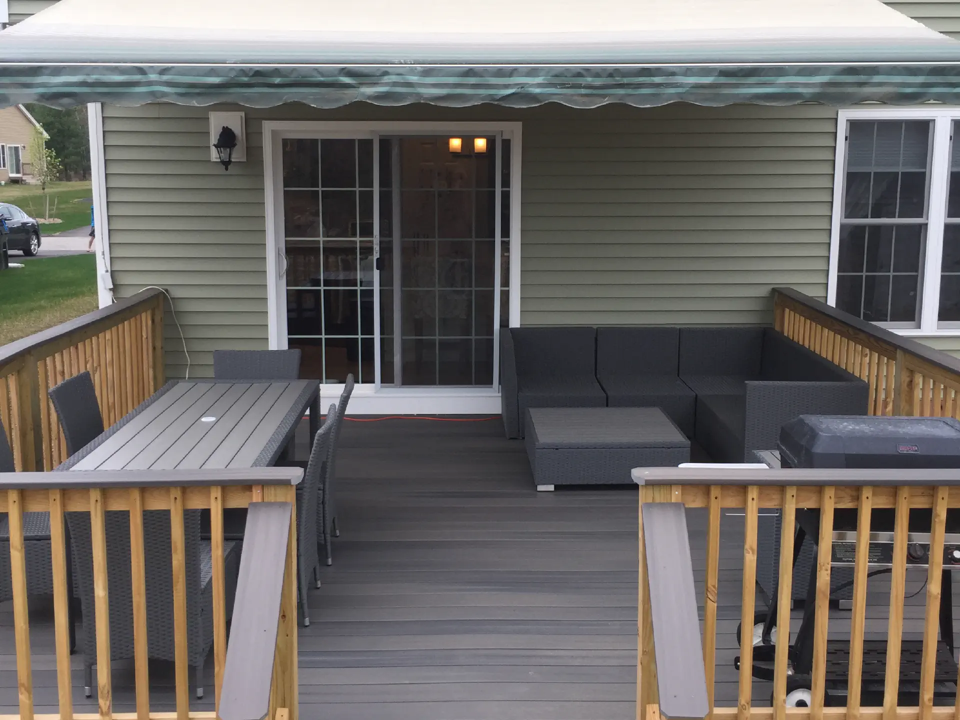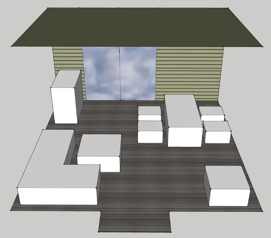 The deck remained empty through the winter, and in the Spring we finally added furniture. To get an idea of what could fit, I made a really rough model of the deck in SketchUp and tried to see if everything we were looking at buying would fit. It ended up working out pretty good, and our size estimates were even oversized which made it easier for everything to fit. We tried to match the furniture to the decking color since the awning and house took on the green color. We ended up moving the grill closer to the sliding door, but we kept the couch and sectional in those spots. We ended up adding extra padding to the sectionals pillows since they were incredibly lacking. Also, we added connectors to keep the sectional pieces together.