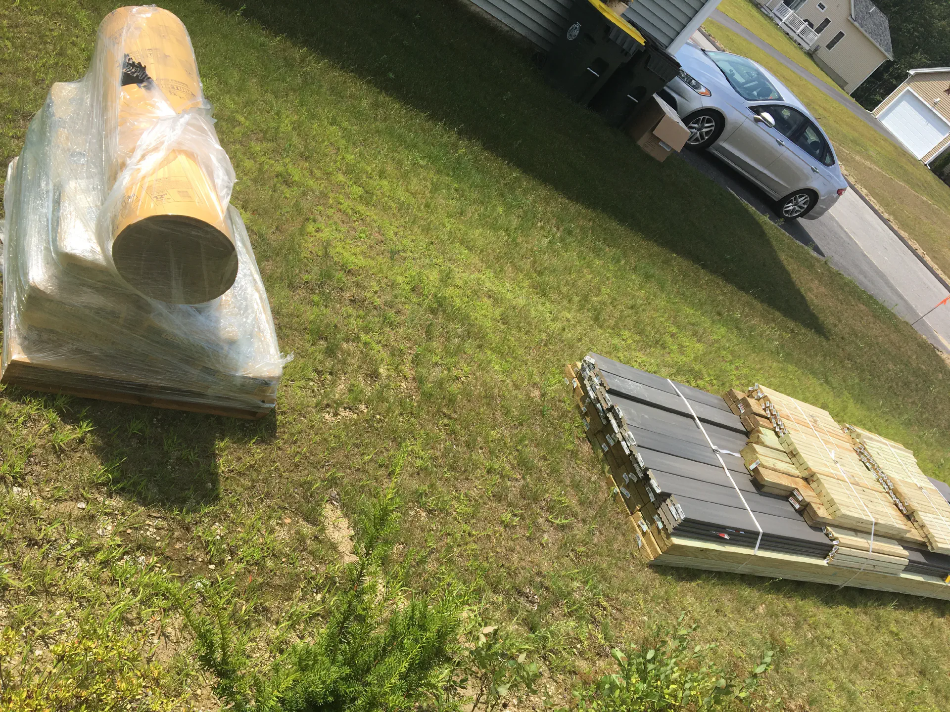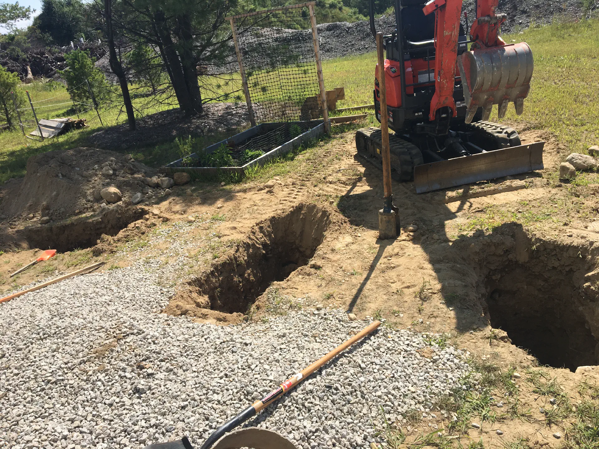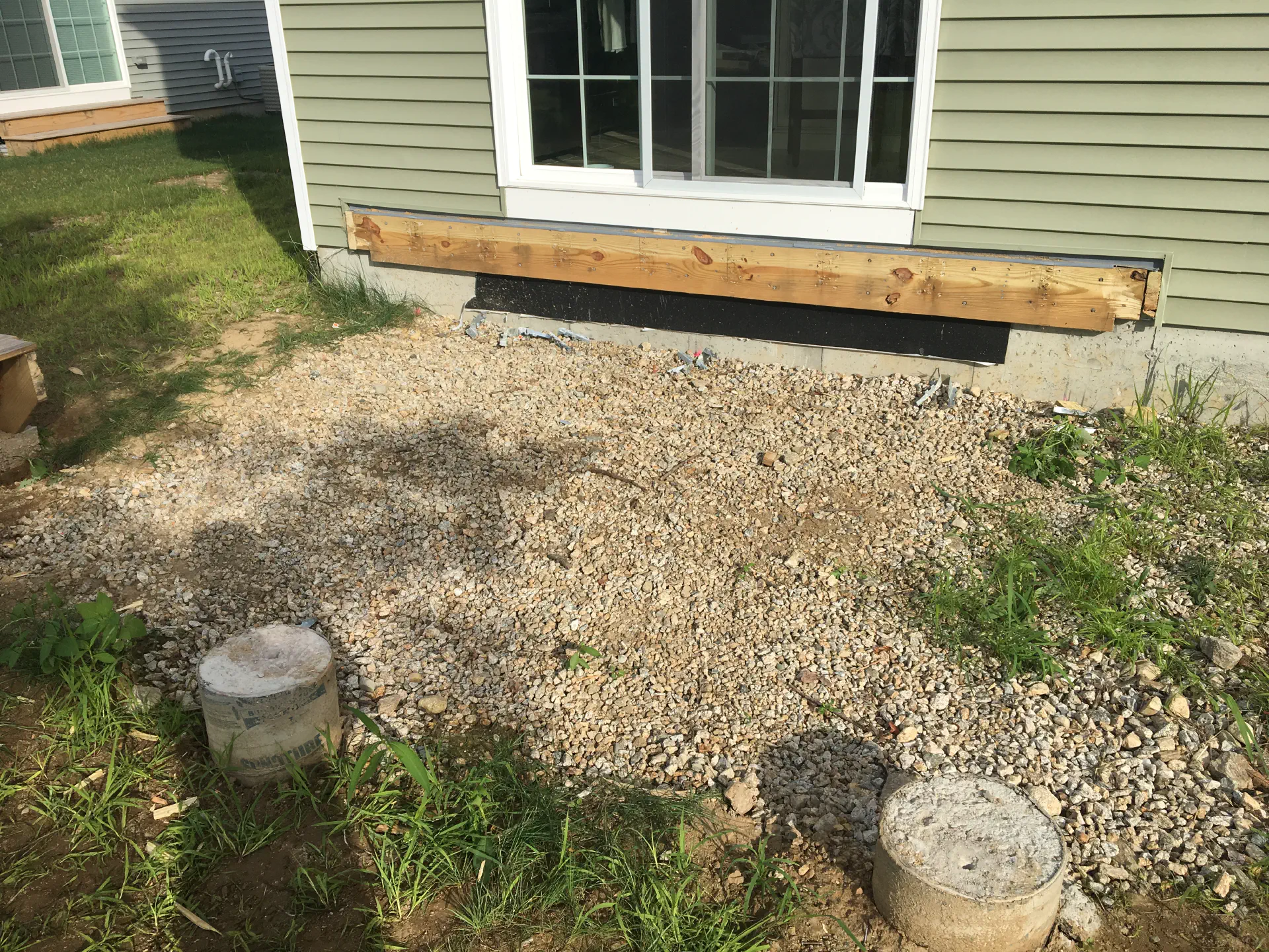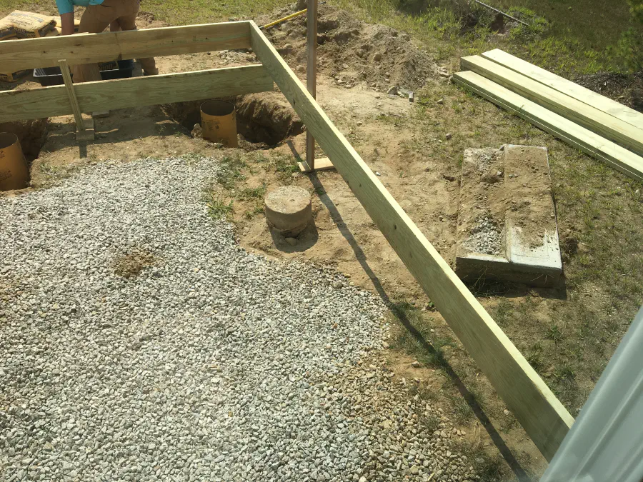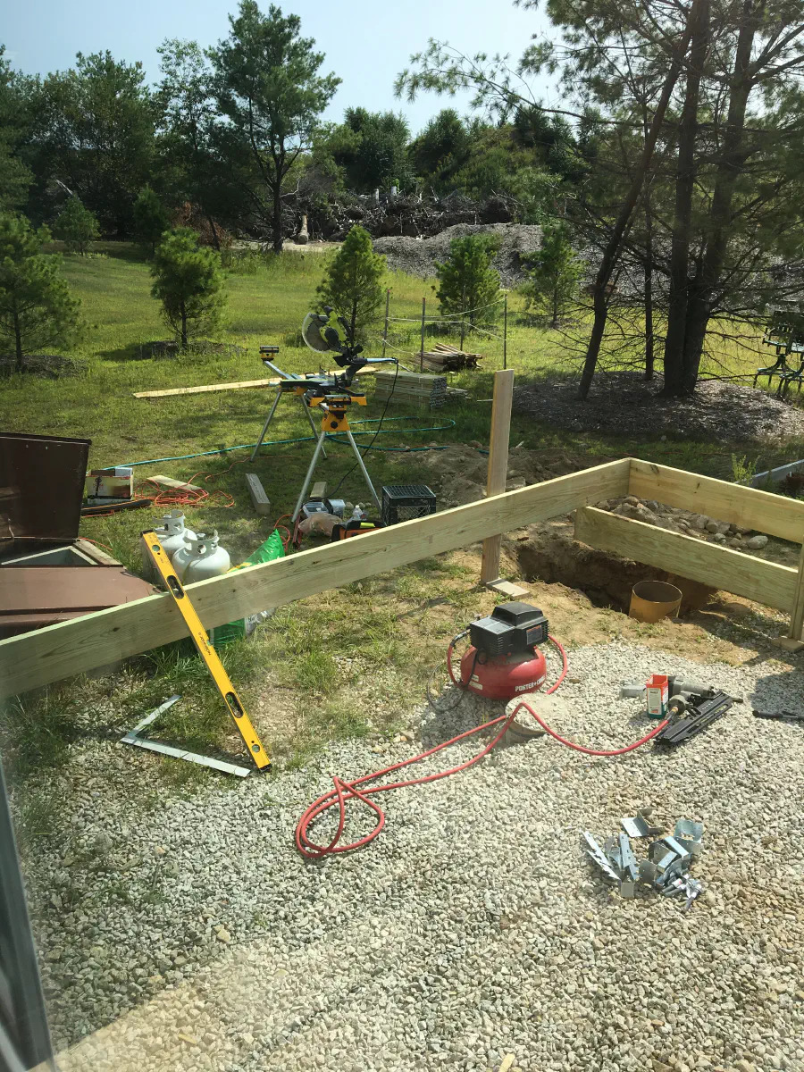 Some family friends came over and removed the old deck. They pulled everything off the house, leaving just the old footings and the ledger board. We ended up replacing this ledger board since it was all marred up from the old deck. This was almost all the materials. We ended up needing some more/different 2x4s since the onces that were picked out were in rough shape. I tried to dig the footings by hand and with an auger, but the home builder left/added in far too many large rocks, so I rented an excavator to make short work of that.