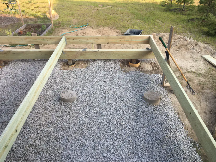 Once the holes were dug, we started work on the frame of the deck. We first laid out the upper frame and the basis for the beam over where the footings were supposed to be, and then filled the footings with concrete. This made it a little harder to fill the tubes, but it made sure the deck was square before it was impossible to move them and let us get it level for the posts the beam rests of.