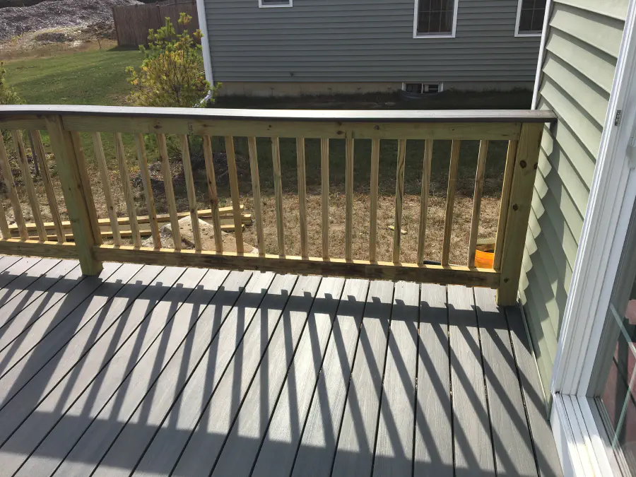 After all the decking was in place, we could attach the railings and balusters. This math was a little difficult to make sure we did not exceed four inches between the balusters, but had as similar as possible gaps for all sections. Since the balusters needed to span inconsistent sized sections, this took a little while to convince ourselves the math was right.