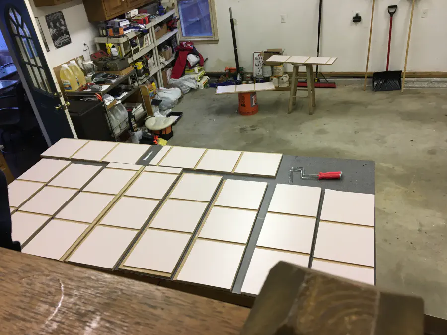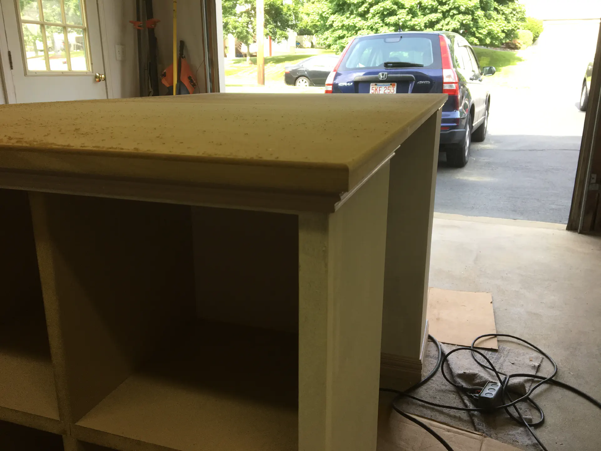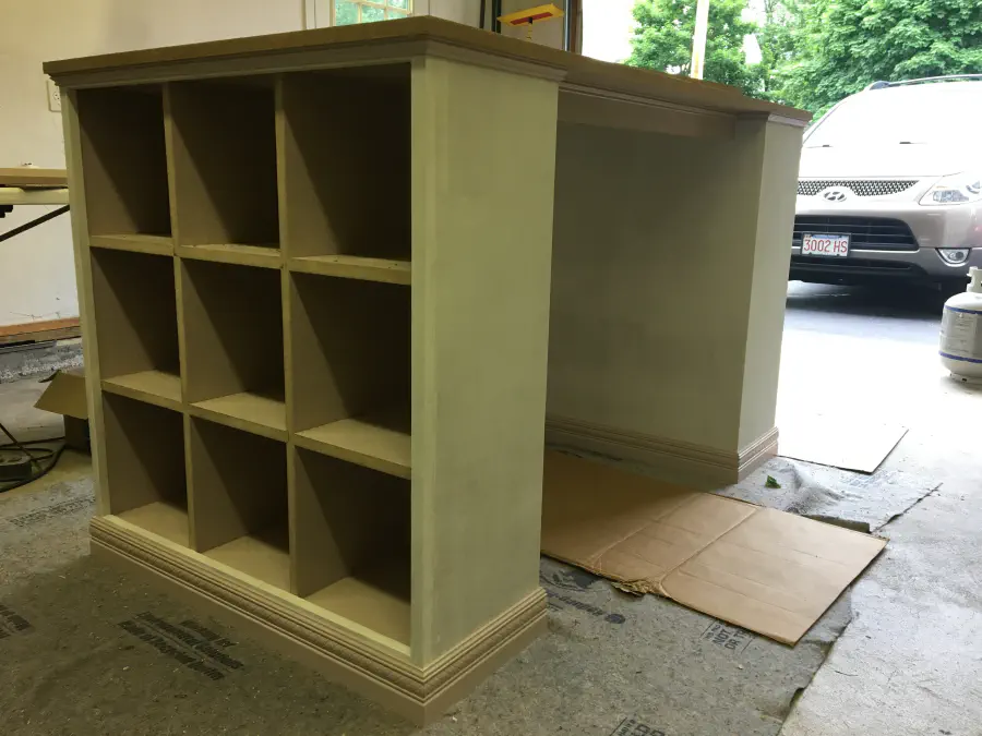 All of the work up till now was at Gina's parents house. When we got it to our garage, we painted the sides of the cabinets and top and bottom of the desk top. Every surface had at least one coat of primer and two coats of paint. The desk top had two coats of primer with heavy sanding after them to get the smoothest possible surface and finished with three coats of paint.