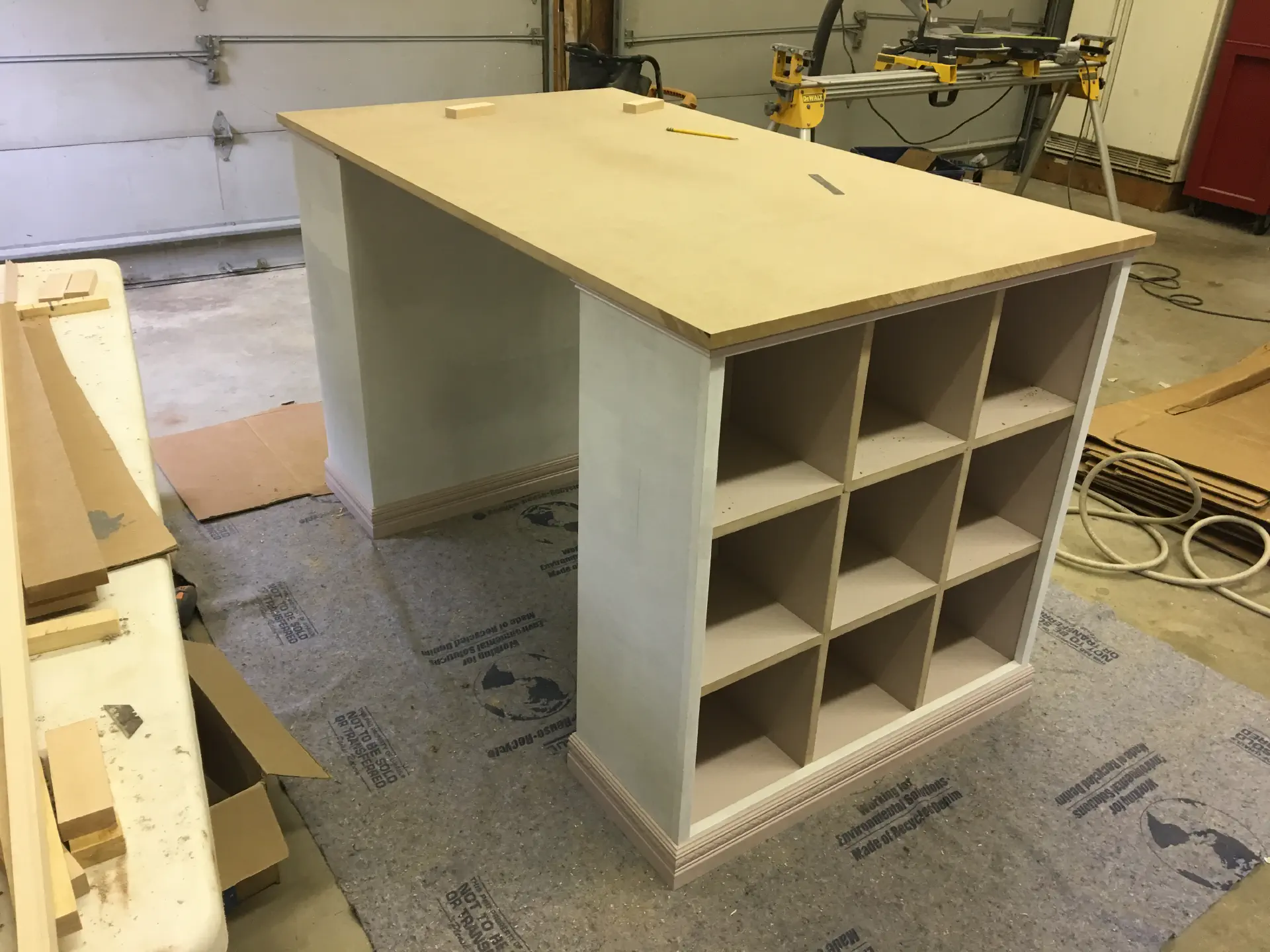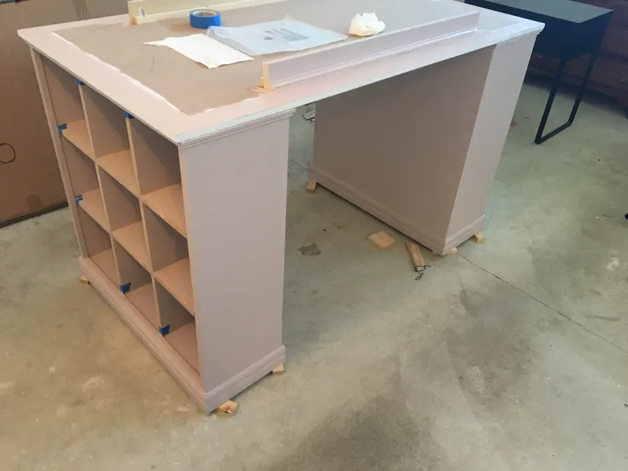 Finally we could put the desk "together" and see how it looked. We added a curtain made out of poplar to give some extra rigidity to the desk top. It was going to span a few feet, so we didn't want it to start to sag over time. Importantly, the curtain is only glued onto the top and not the cabinets so we can actually move the desk. We also rounded over the edges to soften the feel while working at the desk.