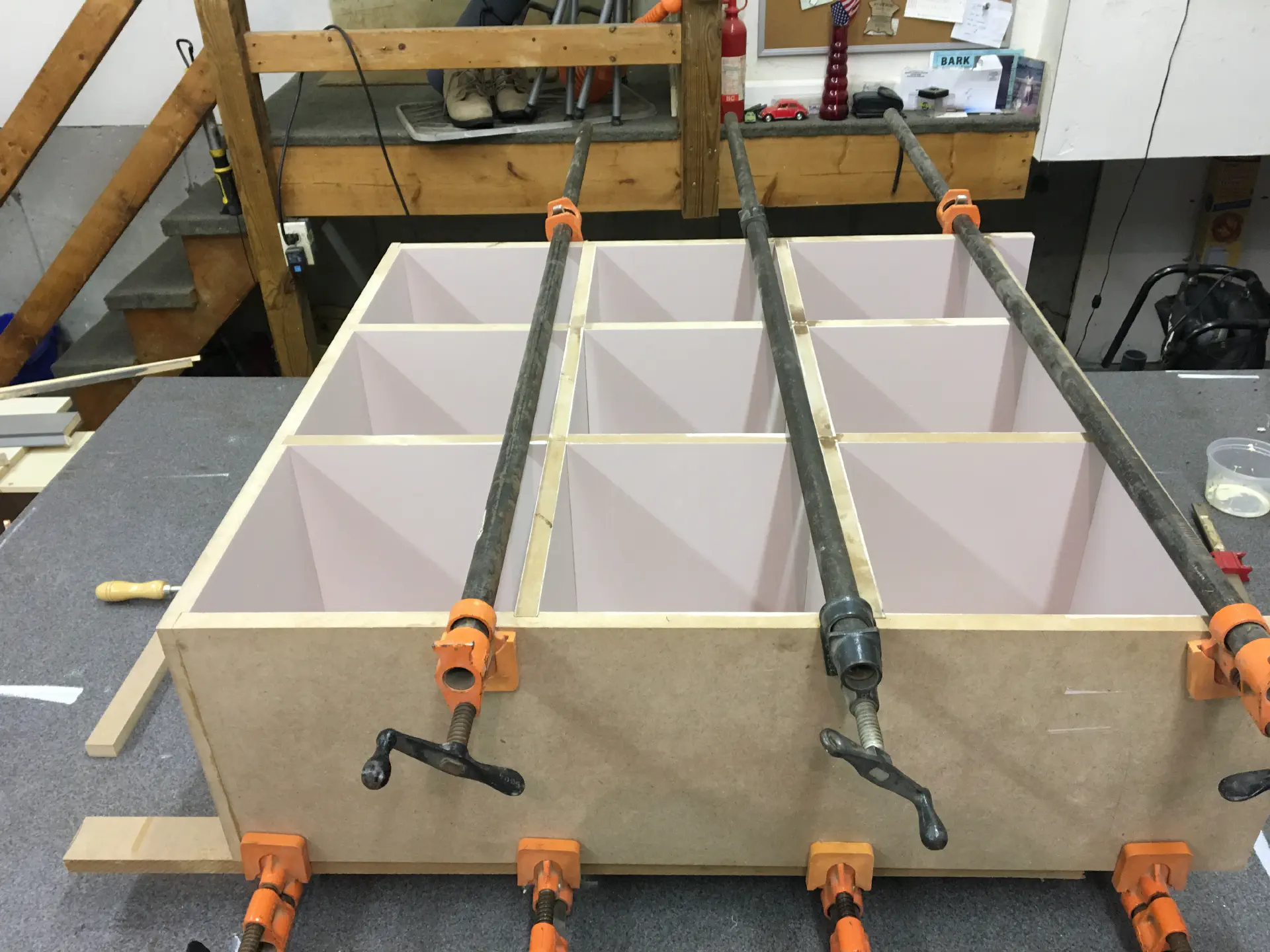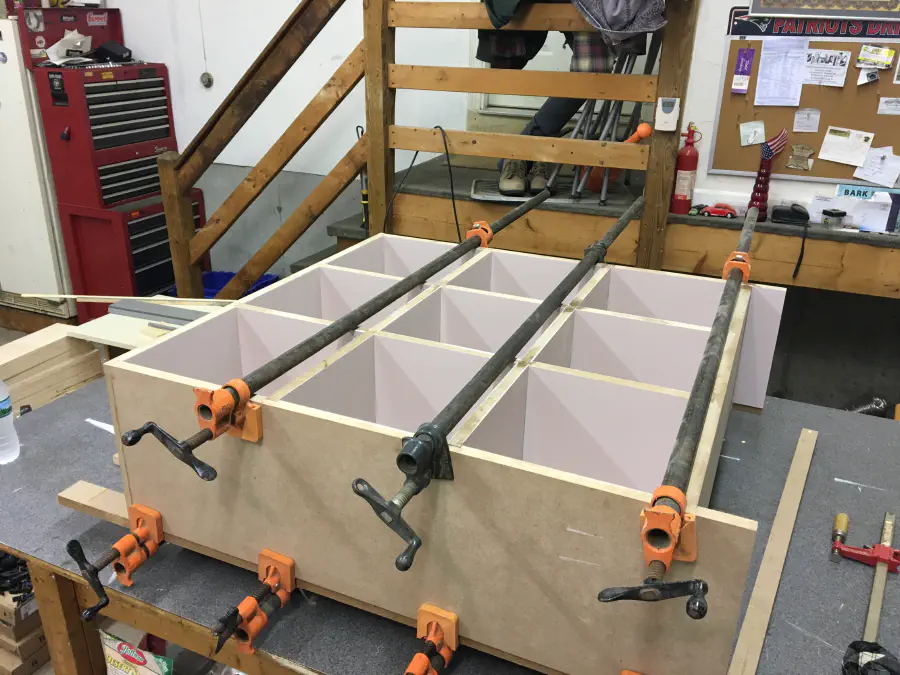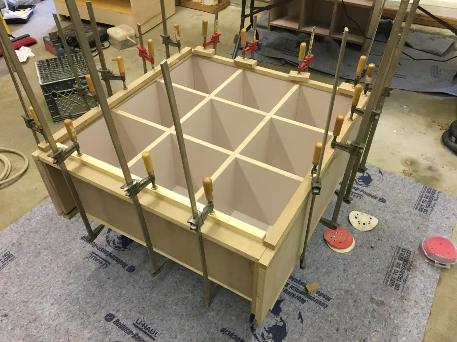 When adding the face frame, we had to use every clamp we had access to. The frame was placed on top of the existing MDF and butt jointed at the corners. Doing this again, I'd probably half-lap those pieces so they sit flush and hold eachother on with more glue surface between them, but this worked well enough. We were able to use scraps from the cabinets for the face frame.