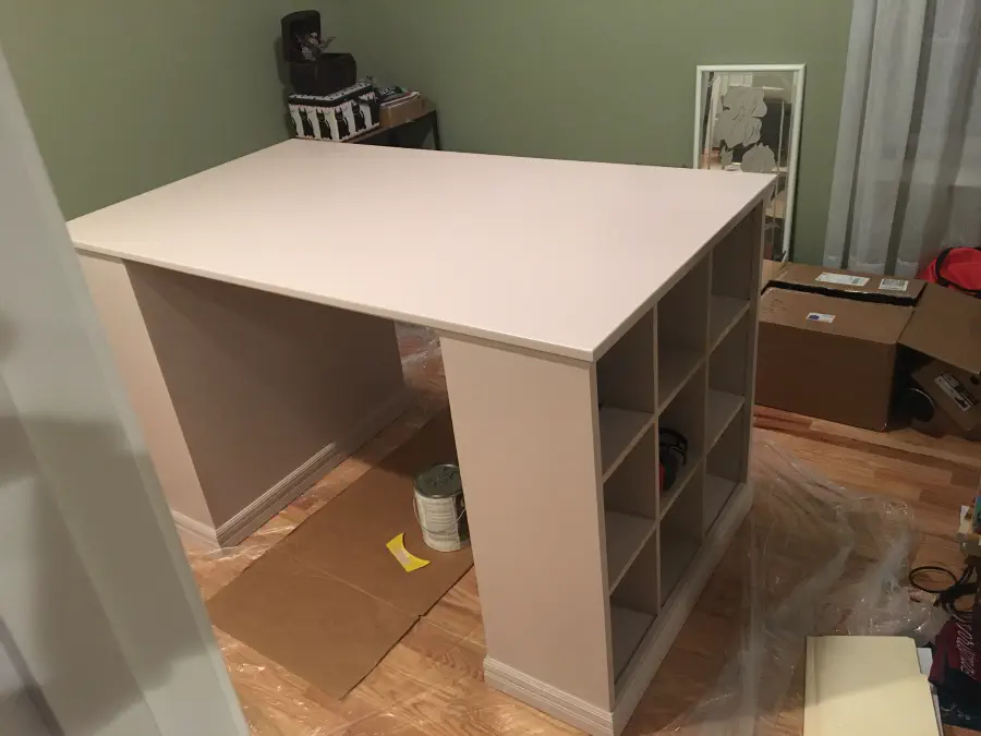 Gina was looking for a new desk since her IKEA corner desk had traveled between at least four different homes and was falling apart, so we decided to build one. I had never done any woodworking before, but was excited to try it out. She was looking for a taller desk, around counter height, so she could stand and work comfortably, or while sitting on a higher (drafting-like?) chair. We broke down multiple sheets of MDF and dadoed the pieces for necessary fits. Rather than paint after assembly, we painted the inner pieces first to save time and make it altogether easier.
