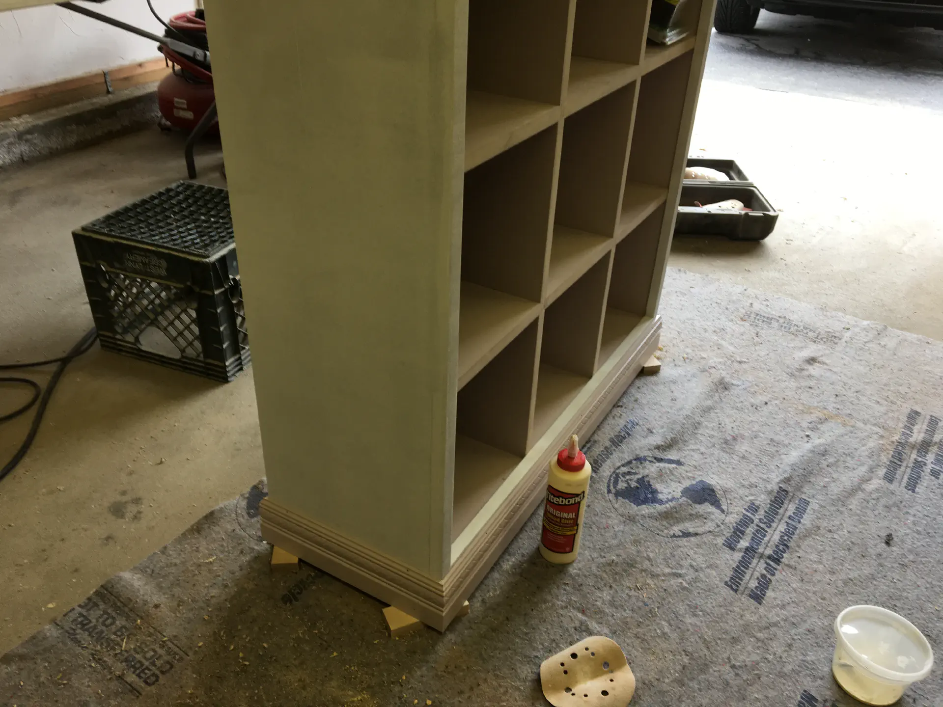 Glueing the two cabinets up was incredibly painful. The number of pieces that had to come together made this much harder than a simple set of shelves. Between Gina, Gina's dad, and myself, we were still racing the clock trying to get glue on everything and assemble them. MDF loves to soak up glue. To make things more difficult, I had accidentally miscut all the middle pieces by an 1/8 of an inch, so when we tried putting on the back, it didn't sit flush to all of the pieces. In the end, to get rid of the bow in the back, I belt sanded down a lot of the MDF. If I did it again, I'm sure it would've come out better, but overall it was a tough glue up.